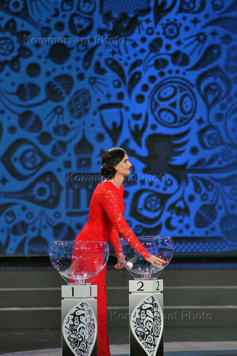 Two-time Olympic champion in pole vaulting Elena Isinbaeva demonstrates a paper with the name of Russia during the official draw ceremony of the FIFA Confederations Cup Russia 2017.