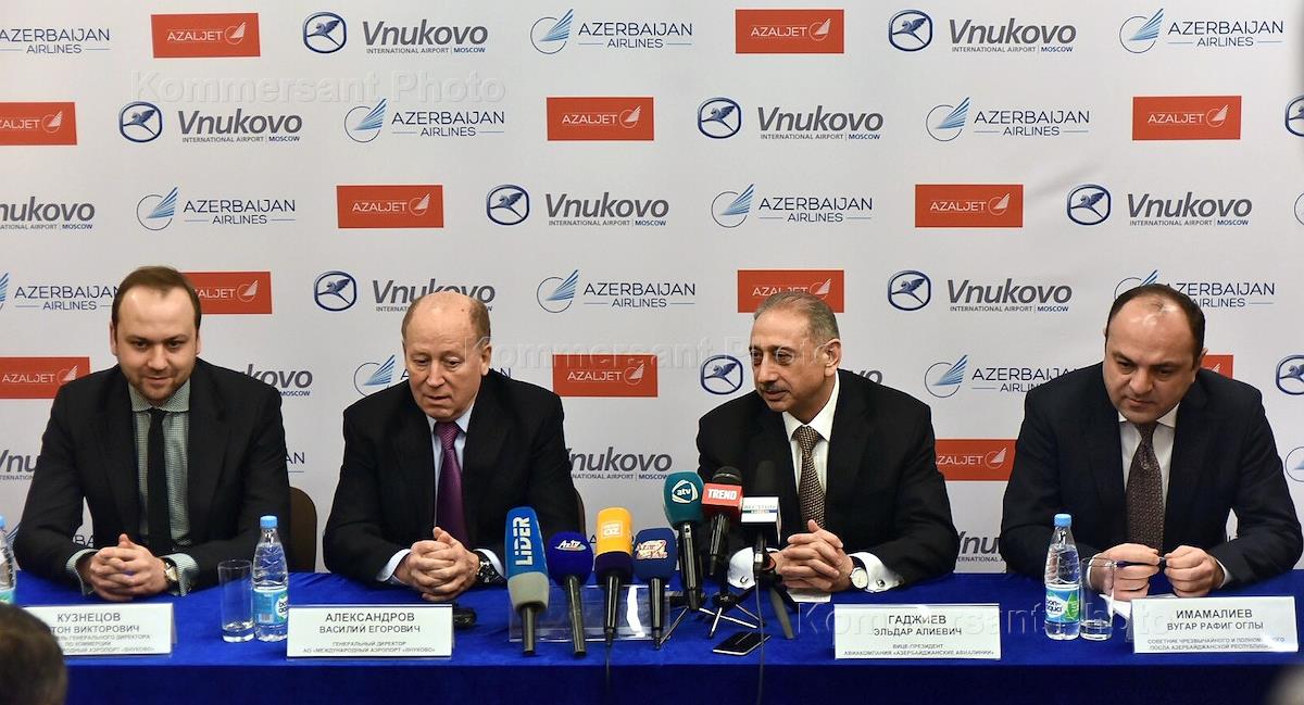 Пресс-конференция "Перспективная программа полетов авиакомпании AZAL "Азербайджанские авиалинии" в аэропорт Внуково в 2017 году". Вице-президент авиакомпании AZAL Эльдар Гаджиев (слева), советник по экономическим вопросам посольства Азербайджанской республики в России Вугар Имамалиев (в центре), генеральный директор аэропорта "Внуково" Василий Александров (справа) после пресс-конференции.
