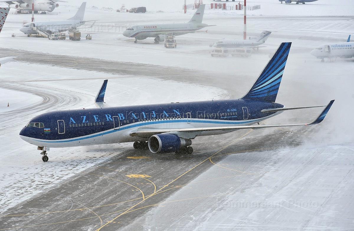 Жанровая фотография. Самолета авиакомпании AZAL "Азербайджанские авиалинии" во время выруливания на полосе в аэропорту Внуково.