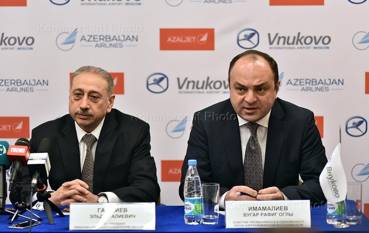Пресс-конференция "Перспективная программа полетов авиакомпании AZAL "Азербайджанские авиалинии" в аэропорт Внуково в 2017 году". Вице-президент авиакомпании AZAL Эльдар Гаджиев (слева) и советник по экономическим вопросам посольства Азербайджанской республики в России Вугар Имамалиев (справа) во время пресс-конференции.