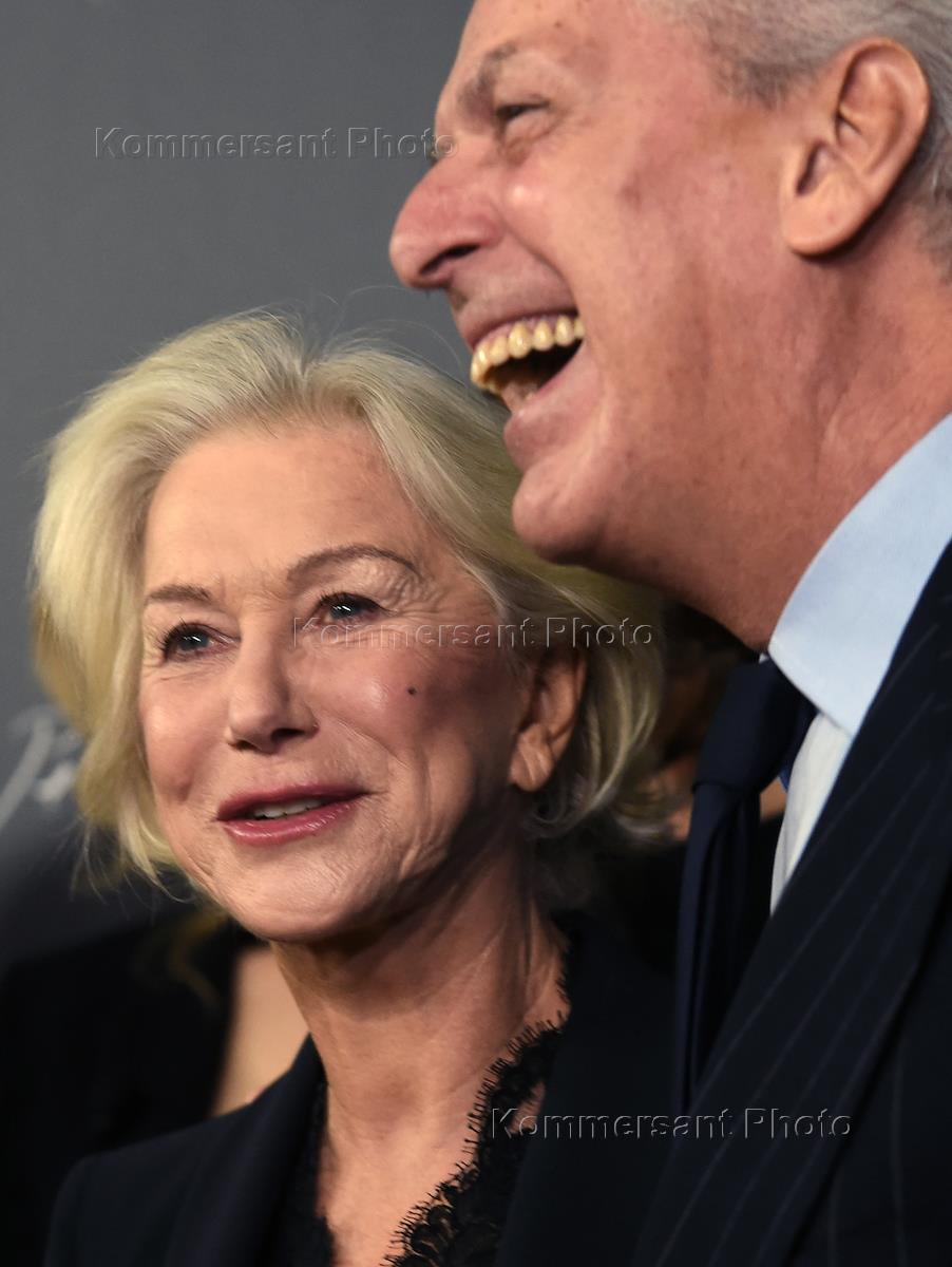 British actress Helen Mirren (left) and Chief Executive Officer of the Pirelli group Marco Tronchetti Provera attend the 2017 Pirelli Calendar presentation at the Hotel Salomon de Rothschild.