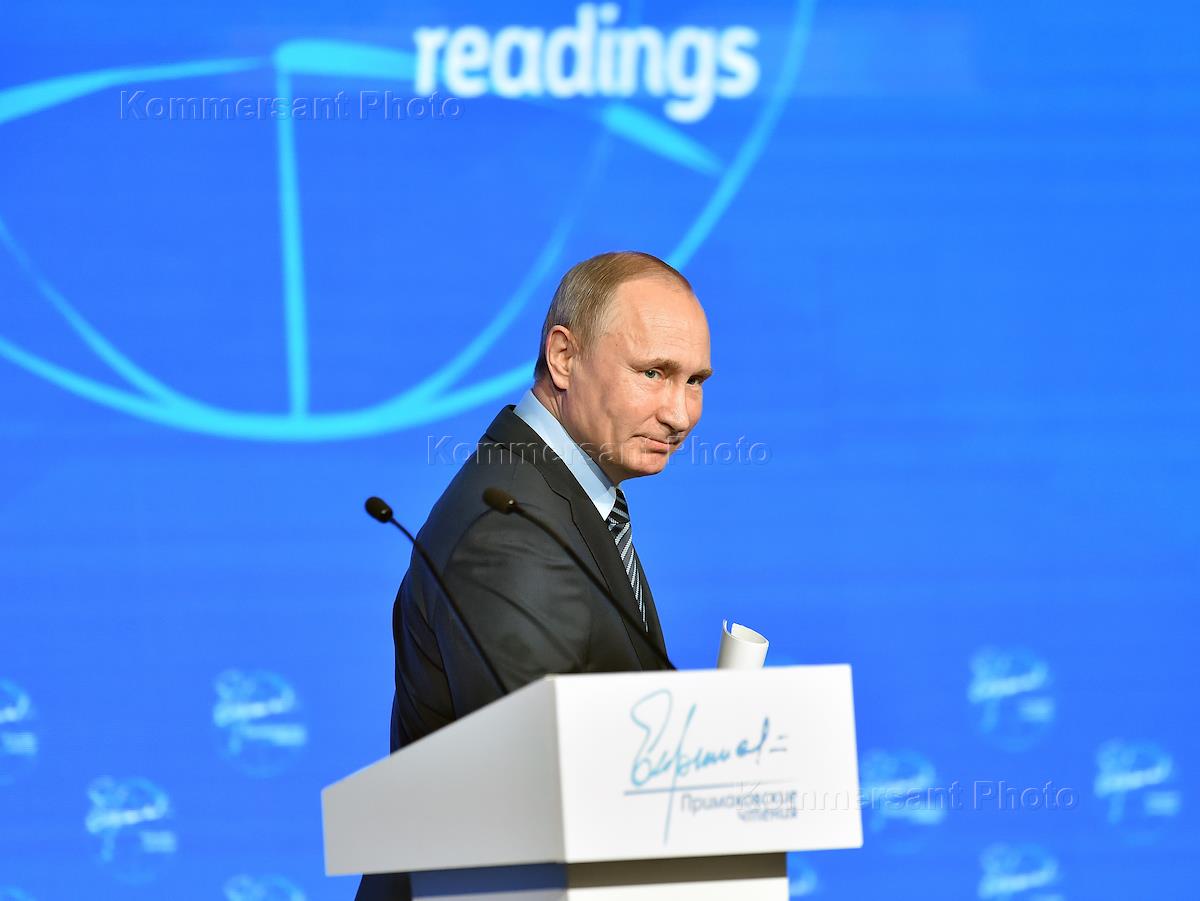 Международная конференция "Первые Примаковские чтения" прошла в Центре международной торговли (ЦМТ). Президент России Владимир Путин во время конференции.