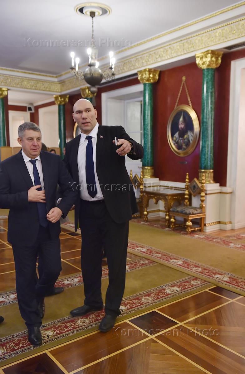 Ежегодное Послание президента России Владимира Путина Федеральному Собранию. Первый заместитель председателя комитета ГД России по экологии и охране окружающей среды Николай Валуев (справа) перед началом оглашения Послания в Мраморном зале Кремля.