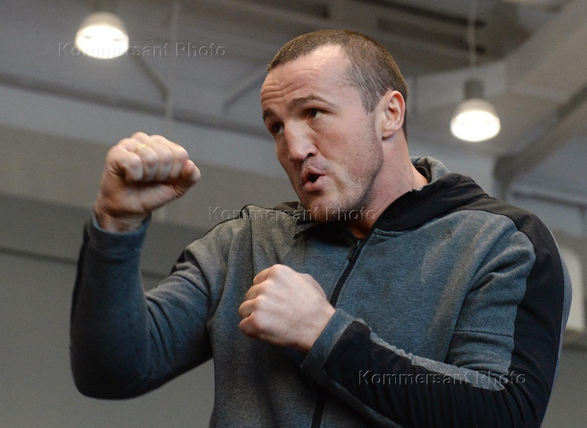 Российский боксер Мурат Гассиев во время открытой тренировки перед боем с боксером Денисом Лебедевым. Тренировка прошла в фитнес-клубе World Class.