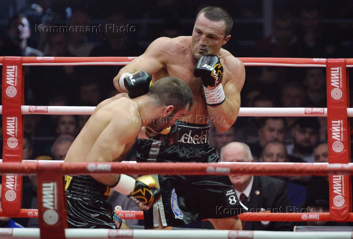 Boxing show of the World of Boxing company. The fight between the WBA (Super) and IBF World Heavyweight Champion Denis Lebedev and the contender for the International Boxing Federation title Murat Gassiev at the Megasport arena. Boxer Murat Gassiev during a fight.