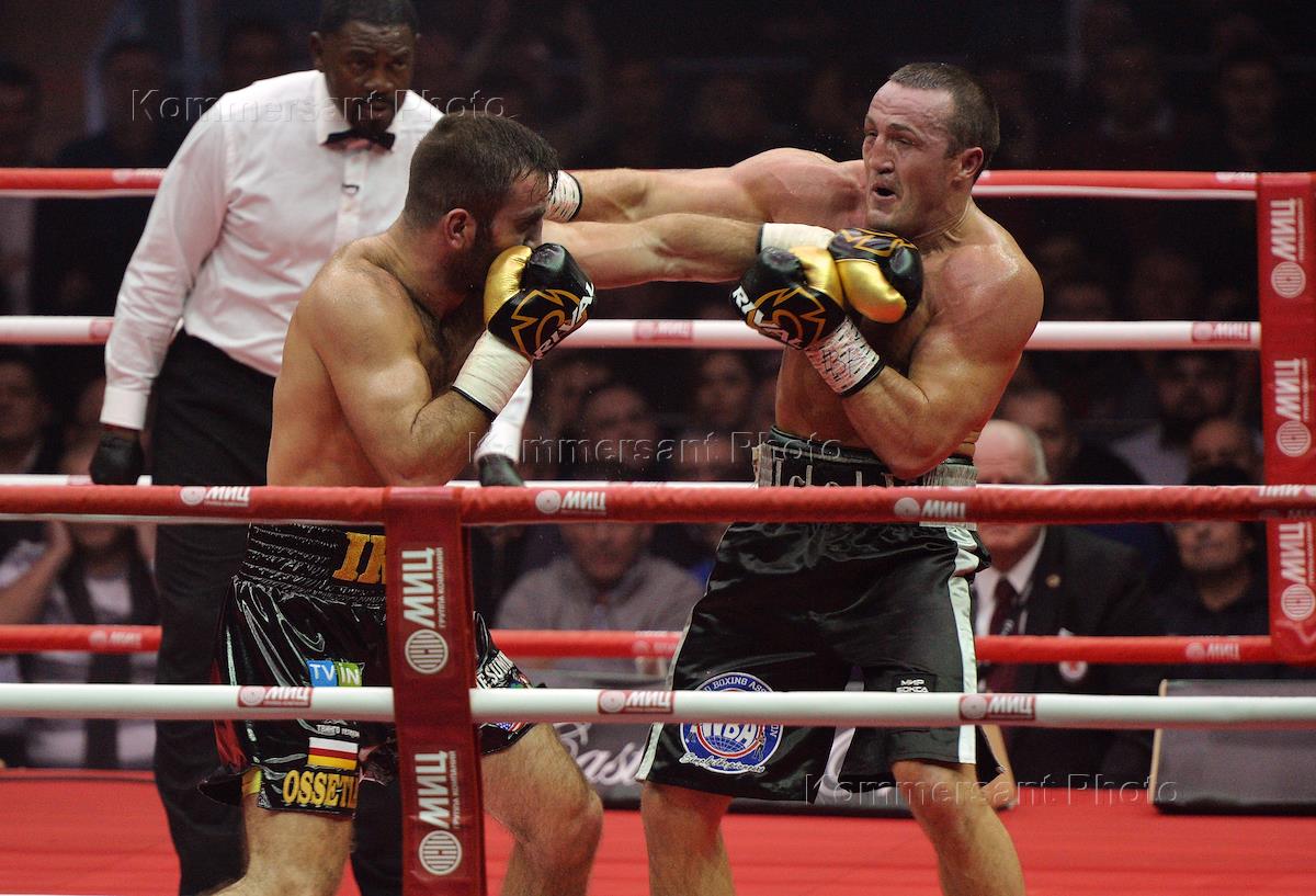 Боксерское шоу компании "Мир бокса". Поединок между чемпионом мира по версиям WBA (Super) и IBF в первом тяжелом весе Денисом Лебедевым и претендентом на титул чемпиона по версии Международной боксерской федерации Муратом Гассиевым прошел на арене "Мегаспорт". Боксеры Денис Лебедев (справа) и Мурат Гассиев (слева) во время поединка.