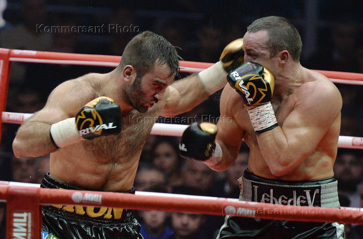 Боксерское шоу компании "Мир бокса". Поединок между чемпионом мира по версиям WBA (Super) и IBF в первом тяжелом весе Денисом Лебедевым и претендентом на титул чемпиона по версии Международной боксерской федерации Муратом Гассиевым прошел на арене "Мегаспорт". Боксер Денис Лебедев (слева) во время поединка.