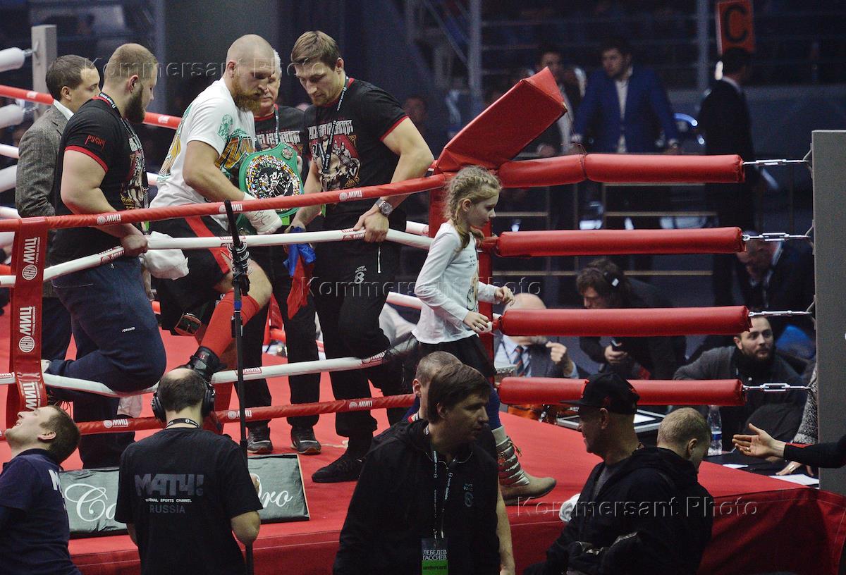 Boxing show of the World of Boxing company. The fight between the WBA (Super) and IBF World Heavyweight Champion Denis Lebedev and the contender for the International Boxing Federation title Murat Gassiev at the Megasport arena. Boxer Murat Gassiev during a fight.
