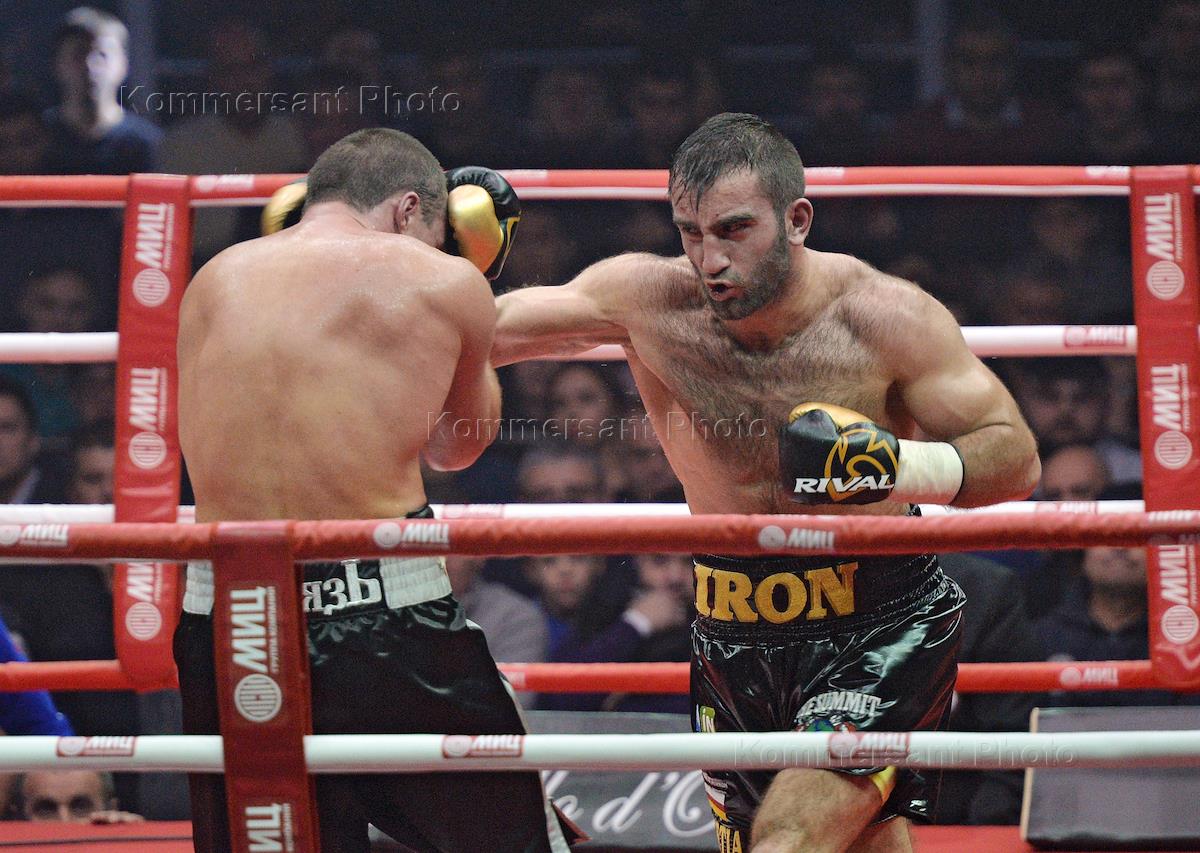Boxing show of the World of Boxing company. The fight between the WBA (Super) and IBF World Heavyweight Champion Denis Lebedev and the contender for the International Boxing Federation title Murat Gassiev at the Megasport arena. Boxer Murat Gassiev during a fight.