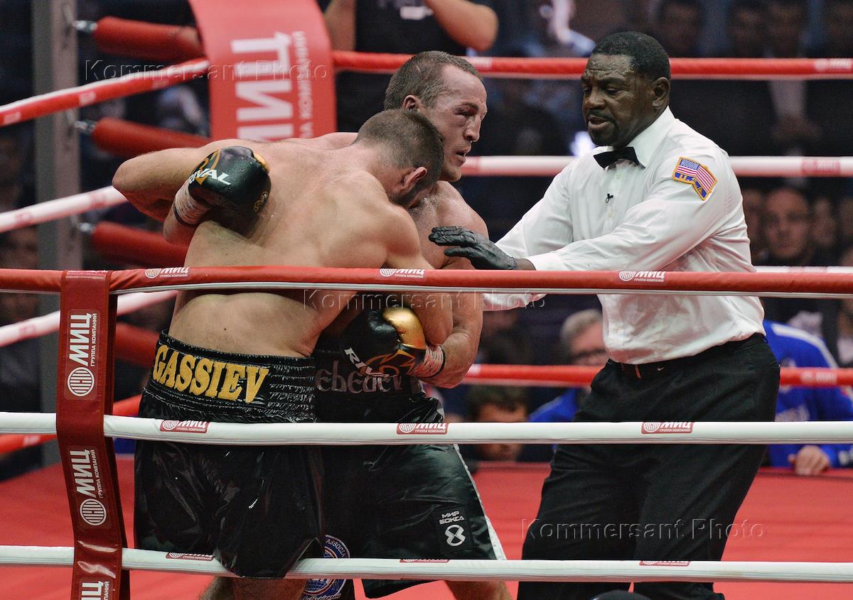 Boxing show of the World of Boxing company. The fight between the WBA (Super) and IBF World Heavyweight Champion Denis Lebedev and the contender for the International Boxing Federation title Murat Gassiev at the Megasport arena. Boxer Murat Gassiev during a fight.