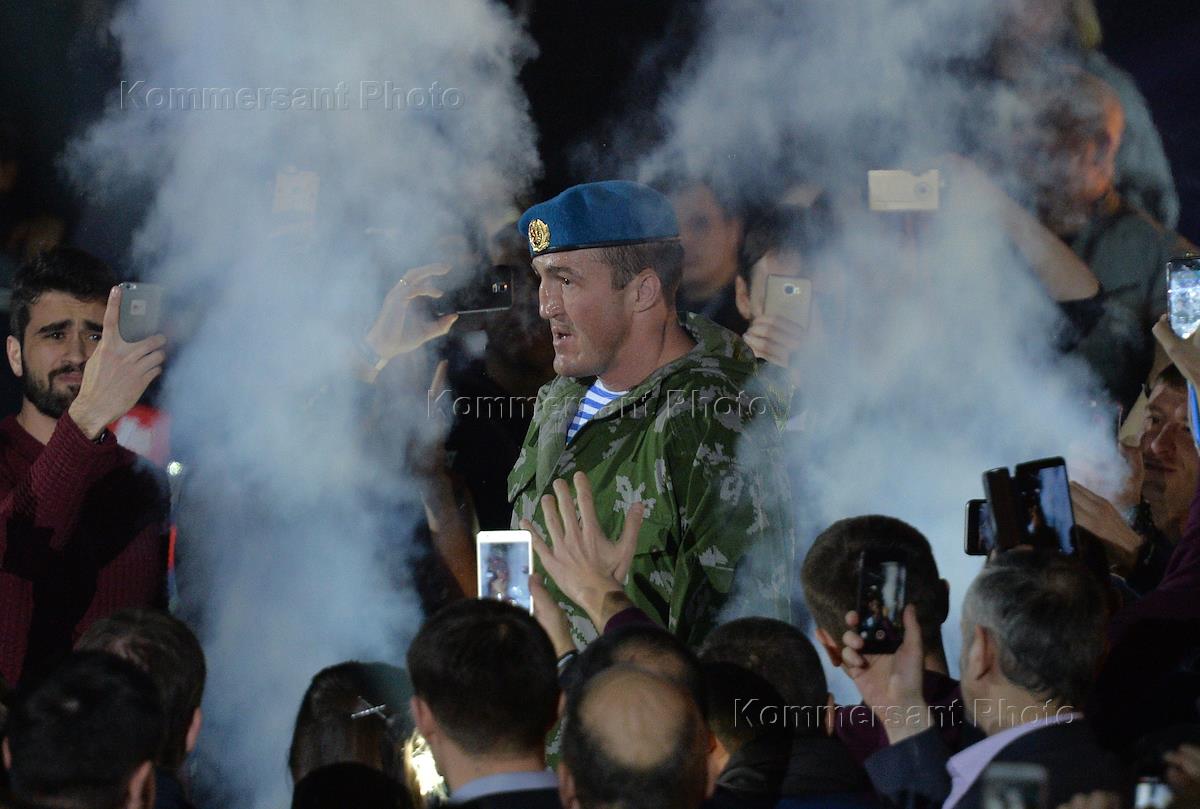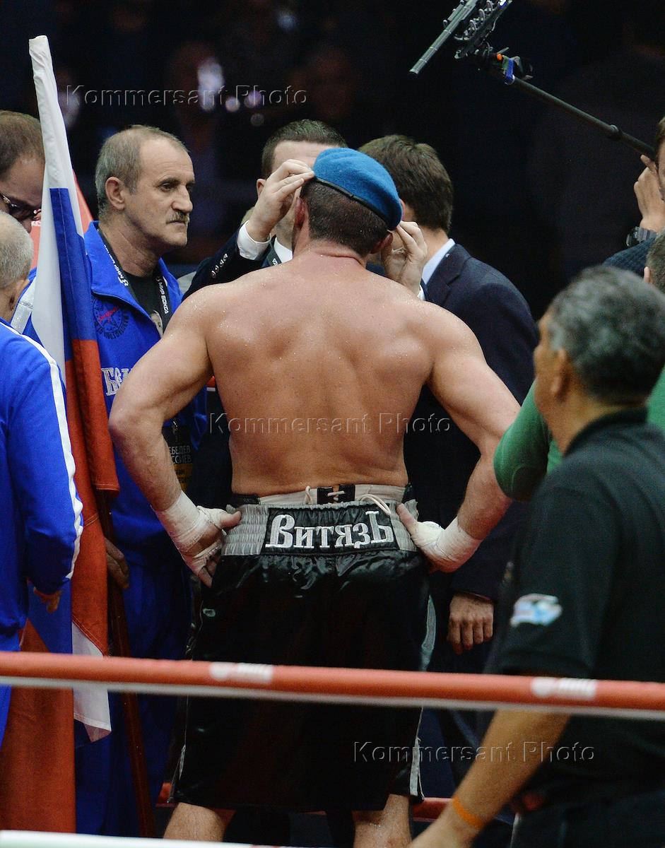 Boxing show of the World of Boxing company. The fight between the WBA (Super) and IBF World Heavyweight Champion Denis Lebedev and the contender for the International Boxing Federation title Murat Gassiev at the Megasport arena. Boxer Murat Gassiev during a fight.