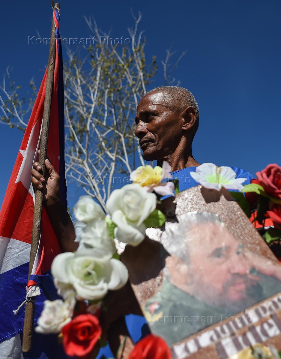 A man holding the portrait of former Cuba's president and revolutionary leader Fidel Castro's stands at the entrance to the Santa Ifigenia cemetery where Castro was buried.