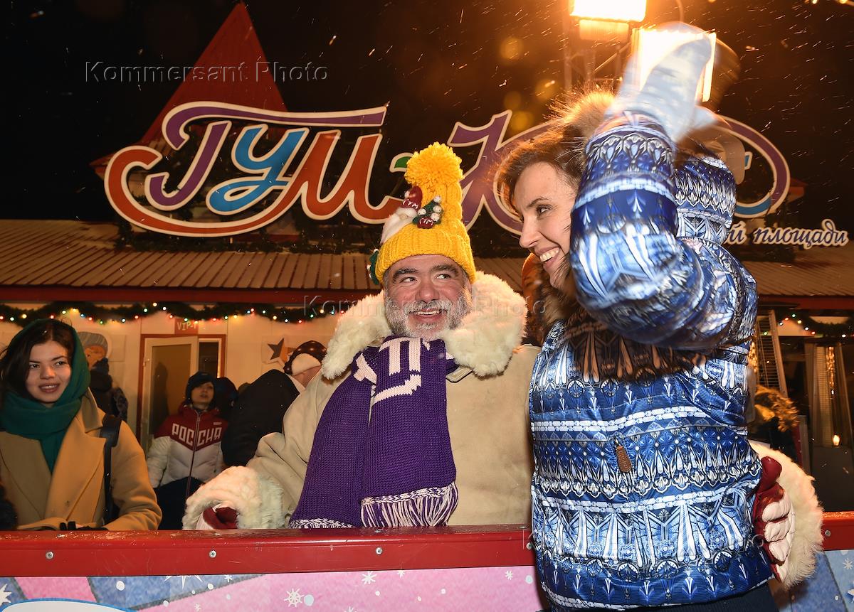 Церемония открытия XI сезона "ГУМ-Катка" и "ГУМ-Ярмарки" на Красной площади. Председатель наблюдательного совета компании Bosco di Ciliegi Михаил Куснирович (в центре) и актриса Ксения Алферова (справа) во время церемонии.