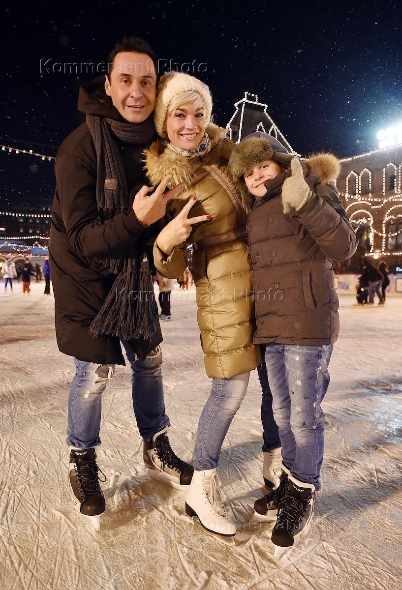 Церемония открытия XI сезона "ГУМ-Катка" и "ГУМ-Ярмарки" на Красной площади. Певец Стас Костюшкин с супругой Юлией и сыном Богданом во время церемонии.