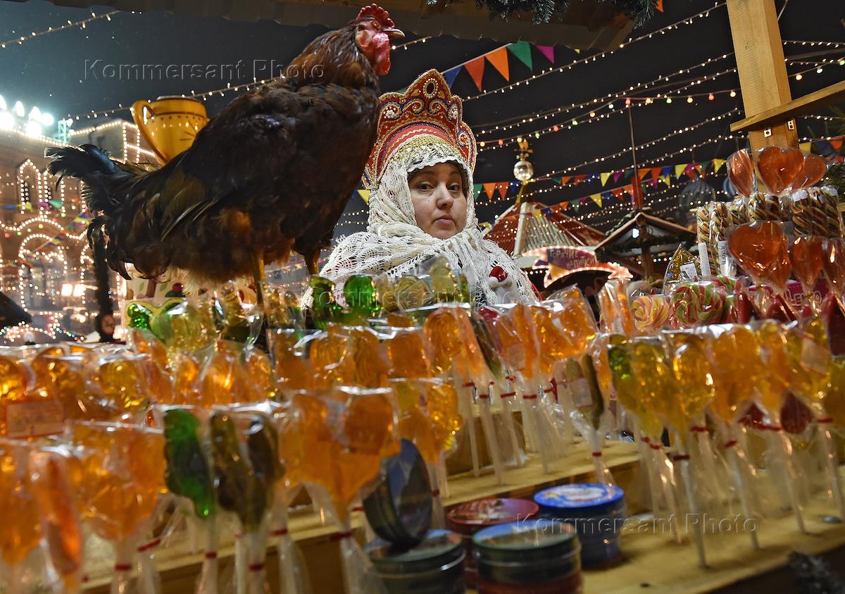 A woman wearing Russian folk costume sells candies at the annual Christmas Market in Red Square.
