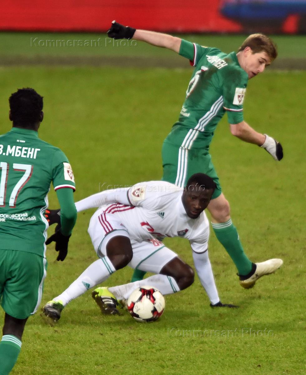 РОСГОССТРАХ - Чемпионат России по футболу. Премьер-лига. 17 тур. Матч между командами "Локомотив" (Москва) - "Терек" (Грозный) прошел на стадионе "Локомотив". Игроки команды "Локомотива" Игорь Денисов (слева), Дельвин Ндинга (справа) и игрок команды "Терек" Беким Балай (в центре) во время матча.