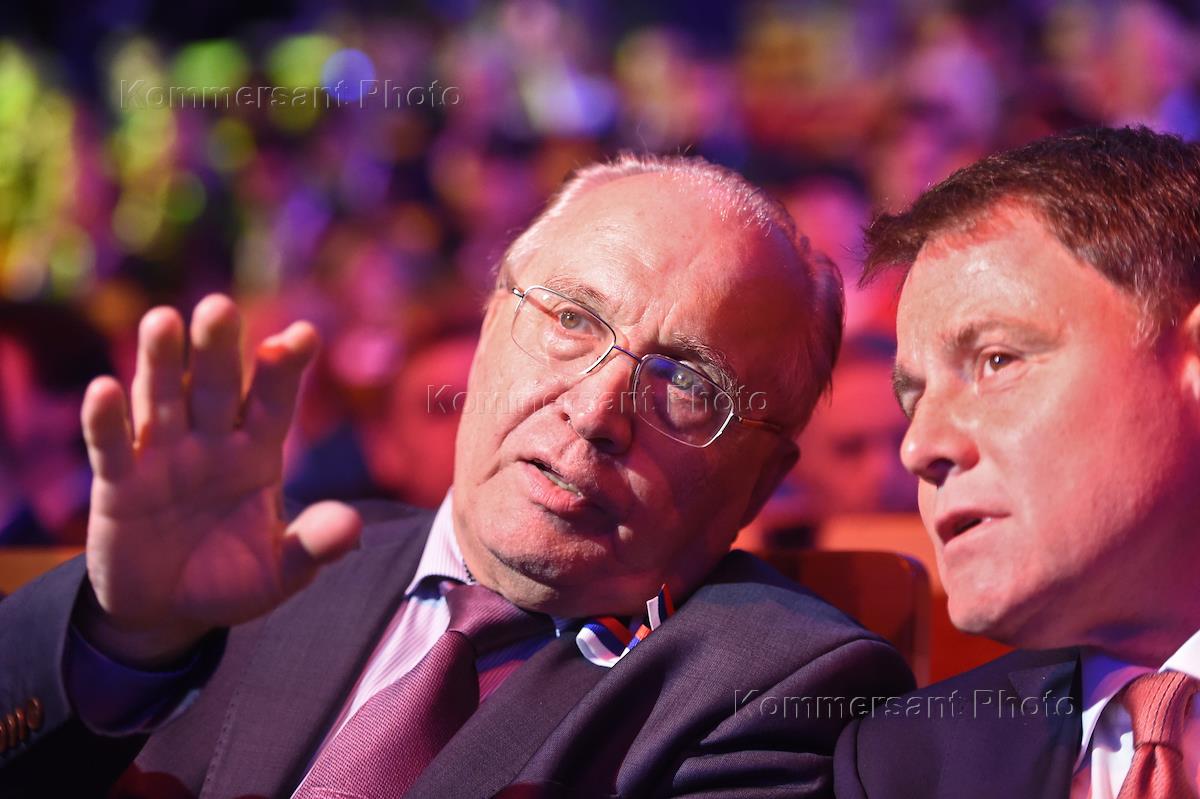 Внеочередной VI съезд Ассоциации юристов России и Восьмая церемония вручения высшей юридической премии "Юрист года" прошли в здании Фундаментальной библиотеки Московского государственного университета имени М.В.Ломоносова. Председателиь Ассоциации юристов России, председатель комитета Государственной думы России по государственному строительству и законодательству Павел Крашенинников (слева) и сопредседатель Ассоциации юристов России, советник президента России Вениамин Яковлев (справа) во время церемонии вручения премии.