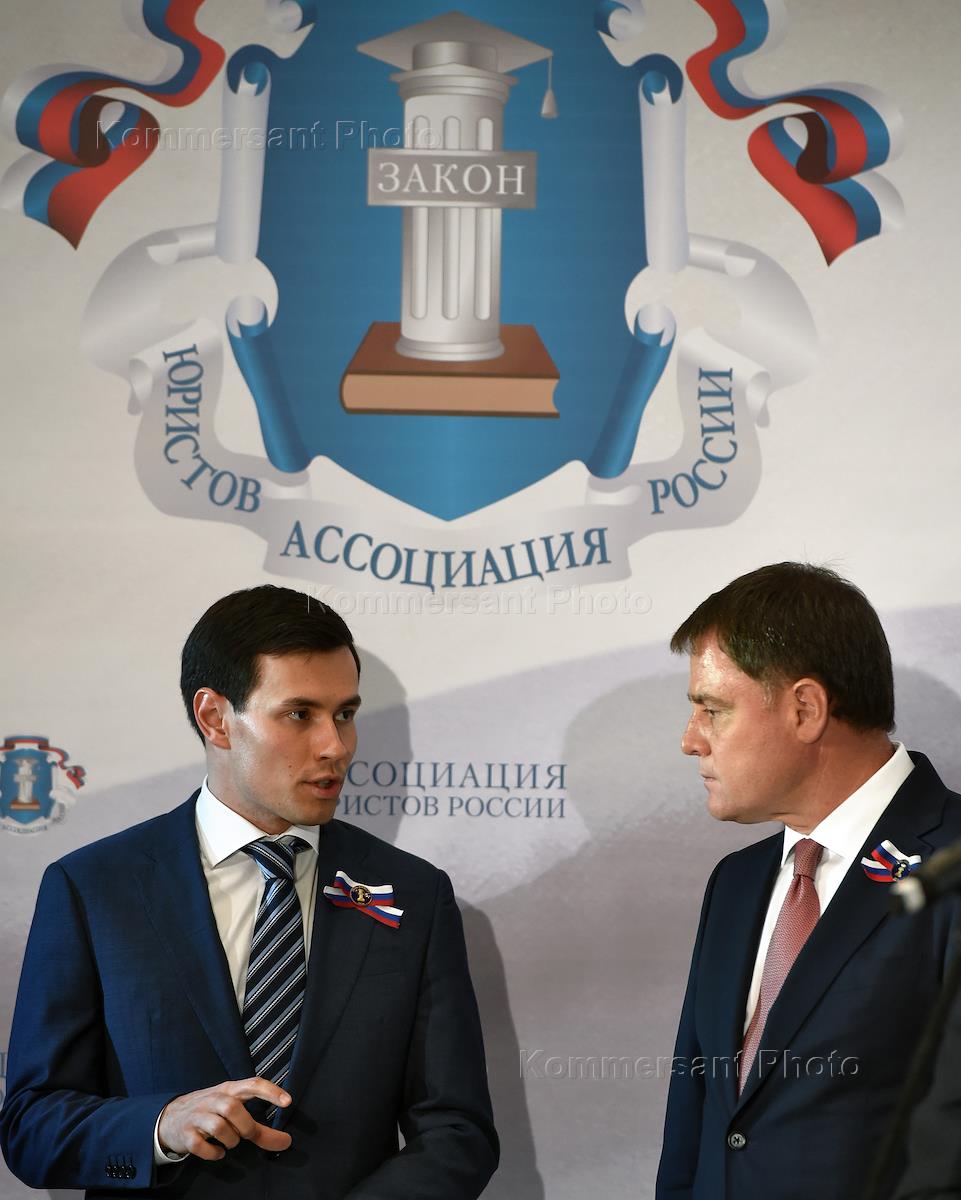 Внеочередной VI съезд Ассоциации юристов России и Восьмая церемония вручения высшей юридической премии "Юрист года" прошли в здании Фундаментальной библиотеки Московского государственного университета имени М.В.Ломоносова. Председателиь Ассоциации юристов России, председатель комитета Государственной думы России по государственному строительству и законодательству Павел Крашенинников (слева) и сопредседатель Ассоциации юристов России, советник президента России Вениамин Яковлев (справа) во время церемонии вручения премии.