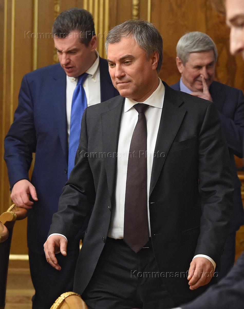 Слева направо: председатель комитета Государственный дум (ГД) России по международным делам Леонид Слуцкий, председатель ГД России Вячеслав Володин и первый заместитель председталье ГД России Иван Мельников во время встречи c генеральным секретарем Совета Европы Турбьёрном Ягландом в Госдуме России.