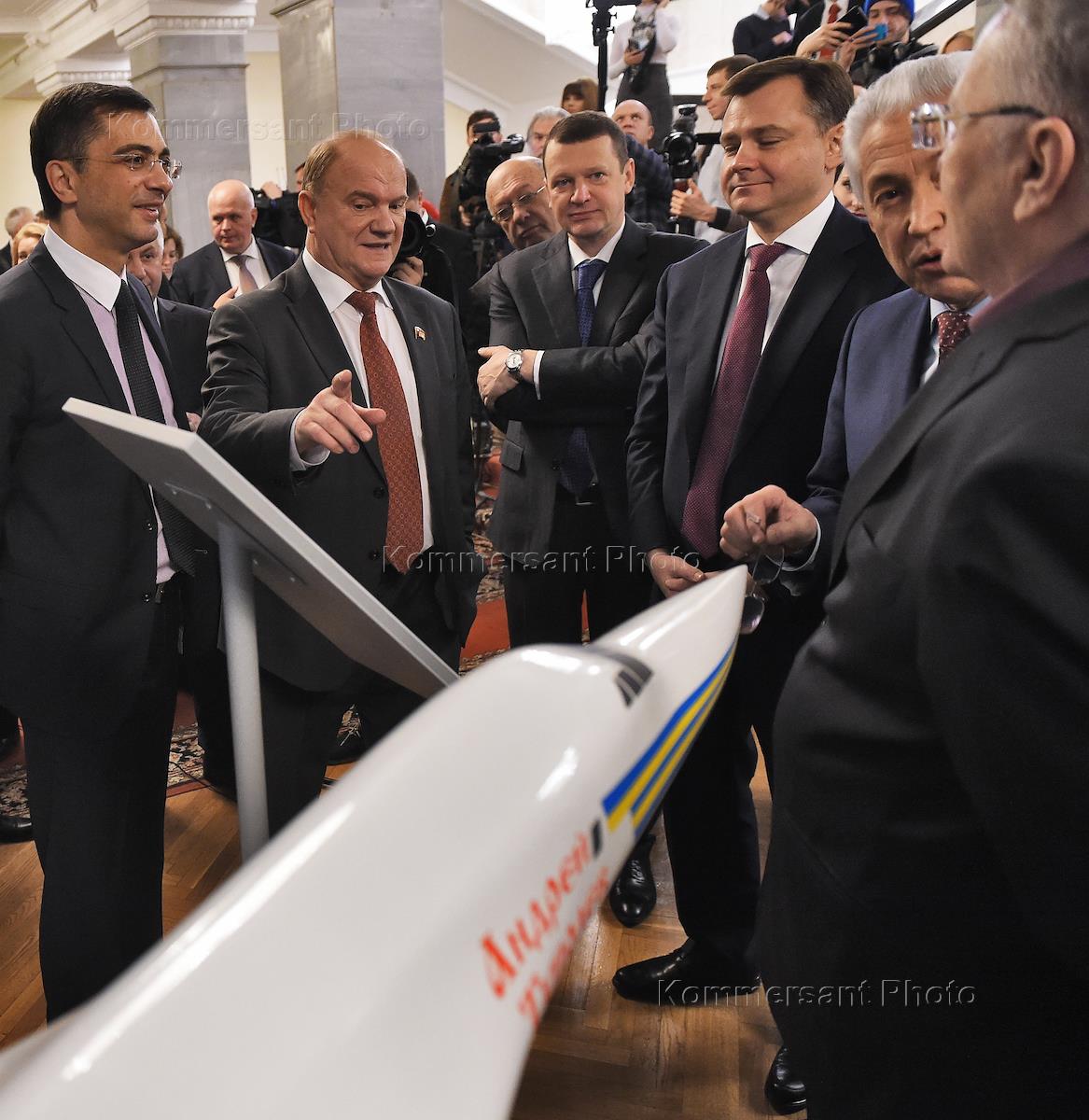 Открытие выставочной экспозиции проспектов, моделей и мобильных стендов, посвященных современным и перспективным образцам гражданской, транспортной и боевой авиации в Госдуме. Лидер Либерально-демократической партии России (ЛДПР), член комитета ГД по обороне Владимир Жириновский (справа), лидер КПРФ, член комитета ГД по делам Содружества Независимых Государств, евразийской интеграции и связям с соотечественниками Геннадий Зюганов (второй слева) и заместитель председателя Государственной Думы Ирина Яровая (в центре) во время открытия выставочной экспозиции.