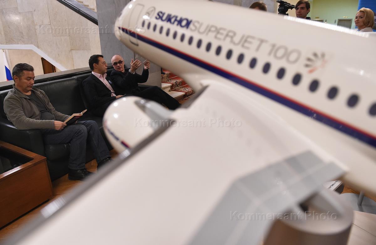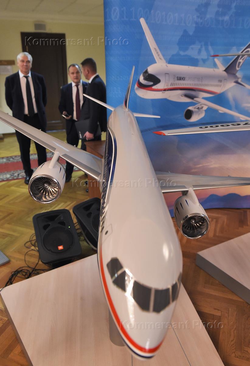 Открытие выставочной экспозиции проспектов, моделей и мобильных стендов, посвященных современным и перспективным образцам гражданской, транспортной и боевой авиации в Госдуме. Авиационная модель Sukhoi Superjet 100 на экспозиции.