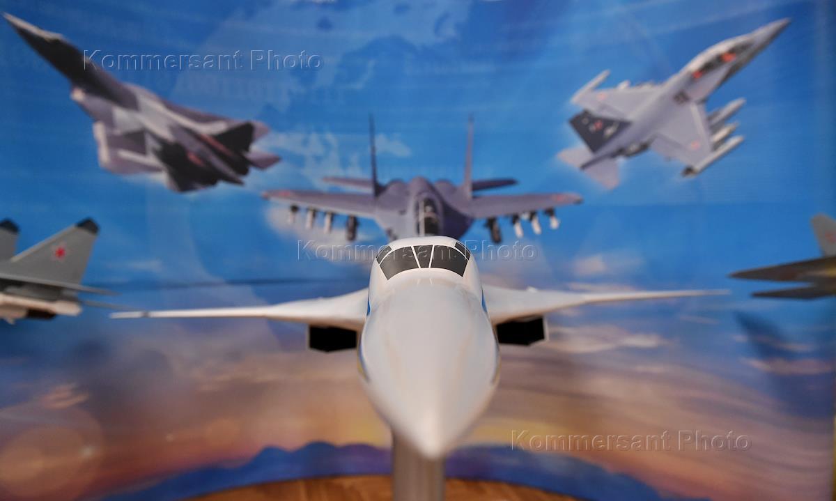 Открытие выставочной экспозиции проспектов, моделей и мобильных стендов, посвященных современным и перспективным образцам гражданской, транспортной и боевой авиации в Госдуме. Авиационная модель на выставочной экспозиции.