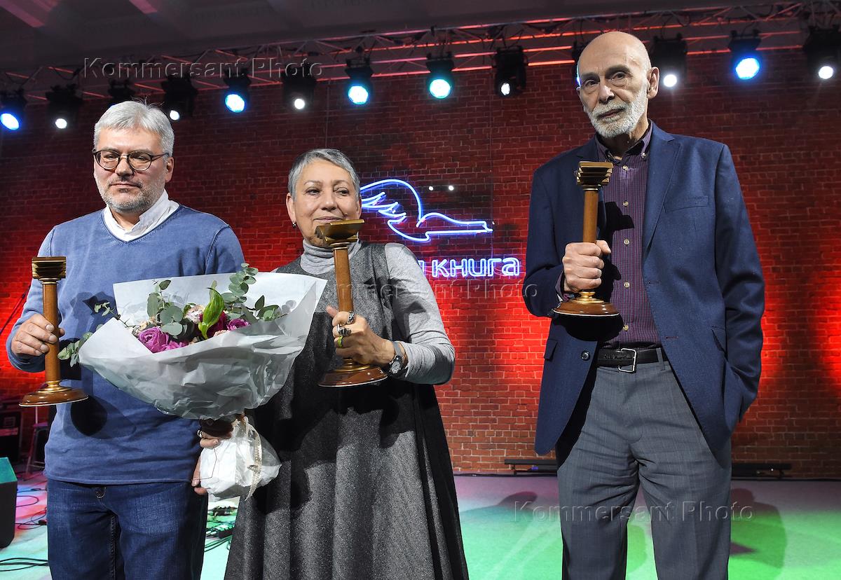 Объявление лауреатов национальной литературной премии "Большая книга" в Доме Пашкова. Слева направо: писатель Евгений Водолазкин, писатель Людмила Улицкая и писатель Леонид Юзефович во время церемонии.
