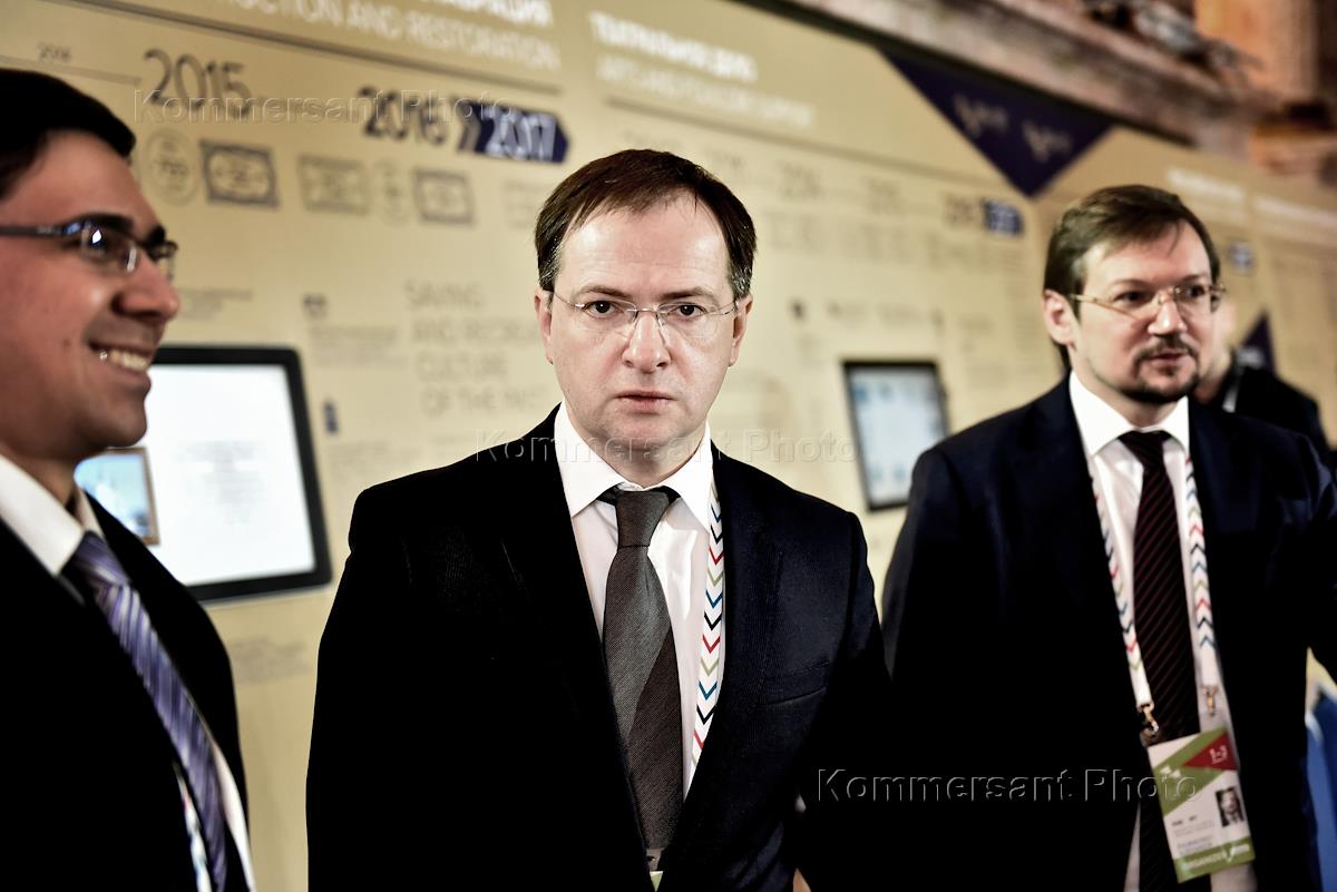 Заместитель министра культуры России Александр Журавский (справа) и министр культуры России Владимир Мединский (в центре) перед началом церемонии вручением "Премиальных сертификатов" Министерства культуры России в рамках V Санкт-Петербургского международного культурного форума.