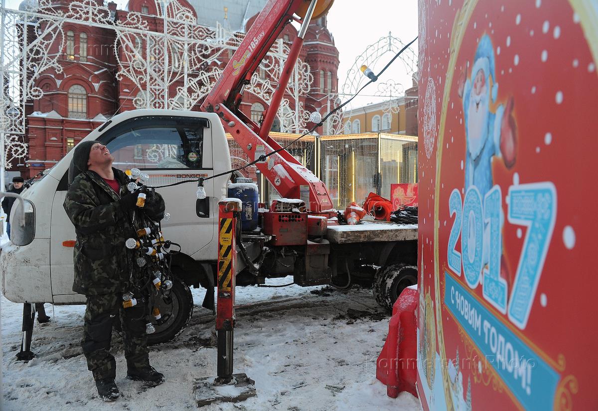 A man dressed as Ded Moroz (literally "Grandfather Frost", Russian equivalent to Santa Claus) hands out tangerines to children at the Christmas market in Moscow.