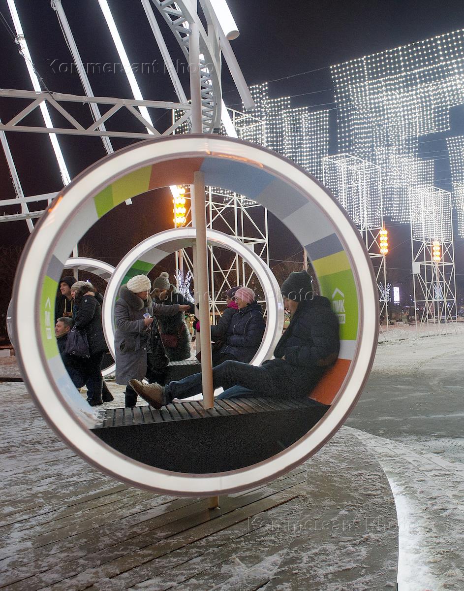 A mother with a child stand next to robot dressed as Ded Moroz (literally "Grandfather Frost", Russian equivalent to Santa Claus) at Sokolniki Park.