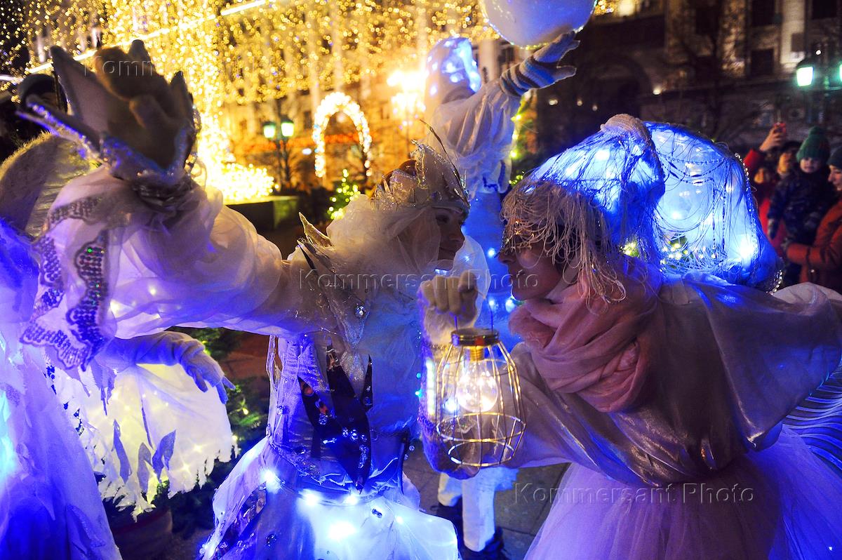 A man dressed as Ded Moroz (literally "Grandfather Frost", Russian equivalent to Santa Claus) hands out tangerines to children at the Christmas market in Moscow.