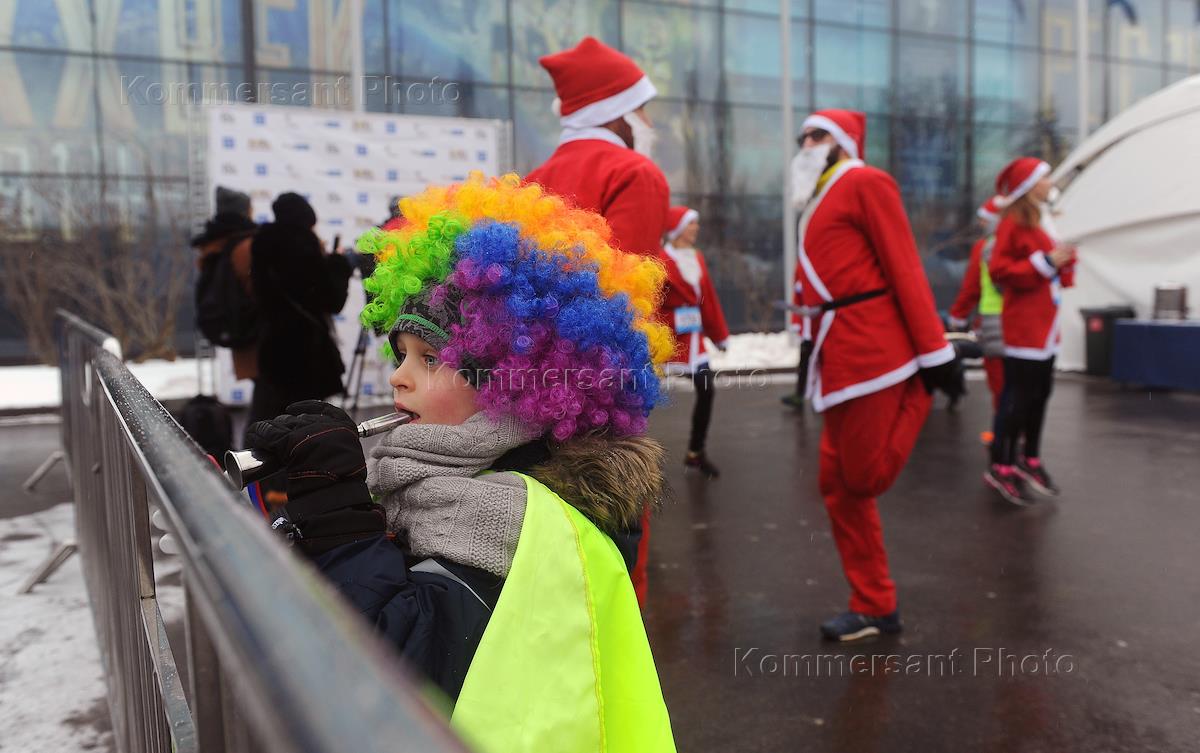A man dressed as Ded Moroz (literally "Grandfather Frost", Russian equivalent to Santa Claus) hands out tangerines to children at the Christmas market in Moscow.