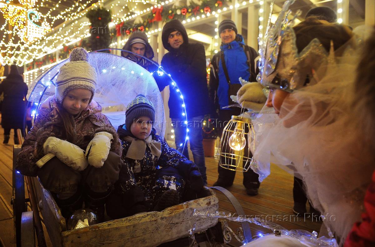 A man dressed as Ded Moroz (literally "Grandfather Frost", Russian equivalent to Santa Claus) hands out tangerines to children at the Christmas market in Moscow.