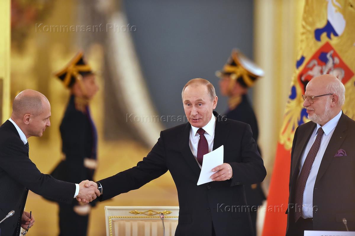 Встреча президента России Владимира Путина с членами президентского Совета по правам человека (СПЧ). Слева направо: первый заместитель главы администрации президента России Cергей Кириенко, президент России Владимир Путин, председатель Совета при президенте России по развитию гражданского общества и правам человека Михаил Федотов во время встречи в Кремле.