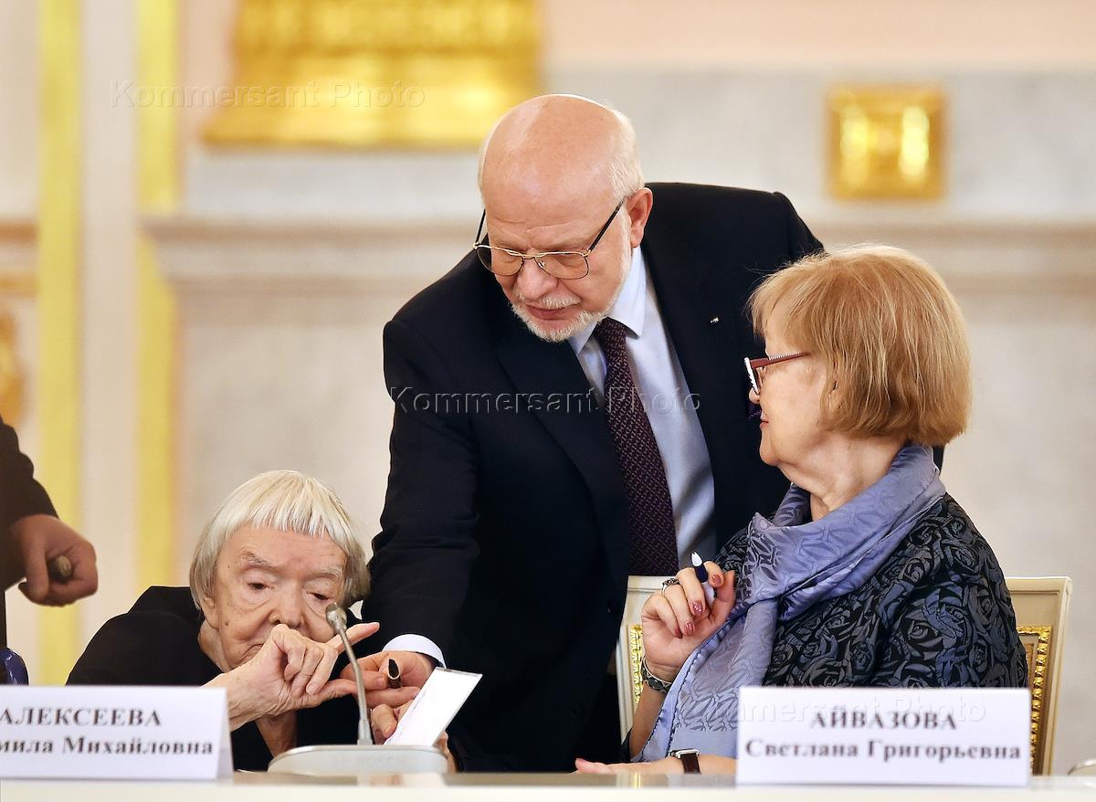 Встреча президента России Владимира Путина с членами президентского Совета по правам человека (СПЧ). Слева направо: председатель Московской Хельсинской группы Людмила Алексеева, председатель Совета при президенте России по развитию гражданского общества и правам человека Михаил Федотов, главный научный сотрудник Института социологии Российской академии науки Светлана Айвазова во время встречи в Кремле.