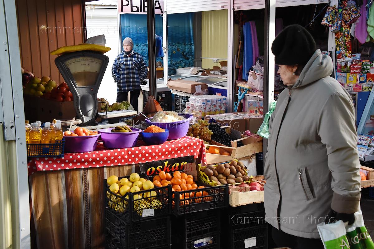 Жанровая фотография. Покупательница на рынке возле прилавка с овощами и фруктами.