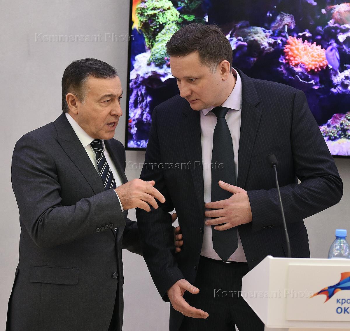 Президент Crocus Group Араз Агаларов (слева) и генеральный директор компании ООО "Атолл-Био" Владимир Еманов (справа) во время церемонии открытия "Крокус Сити Океанариума".