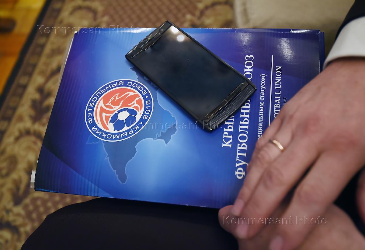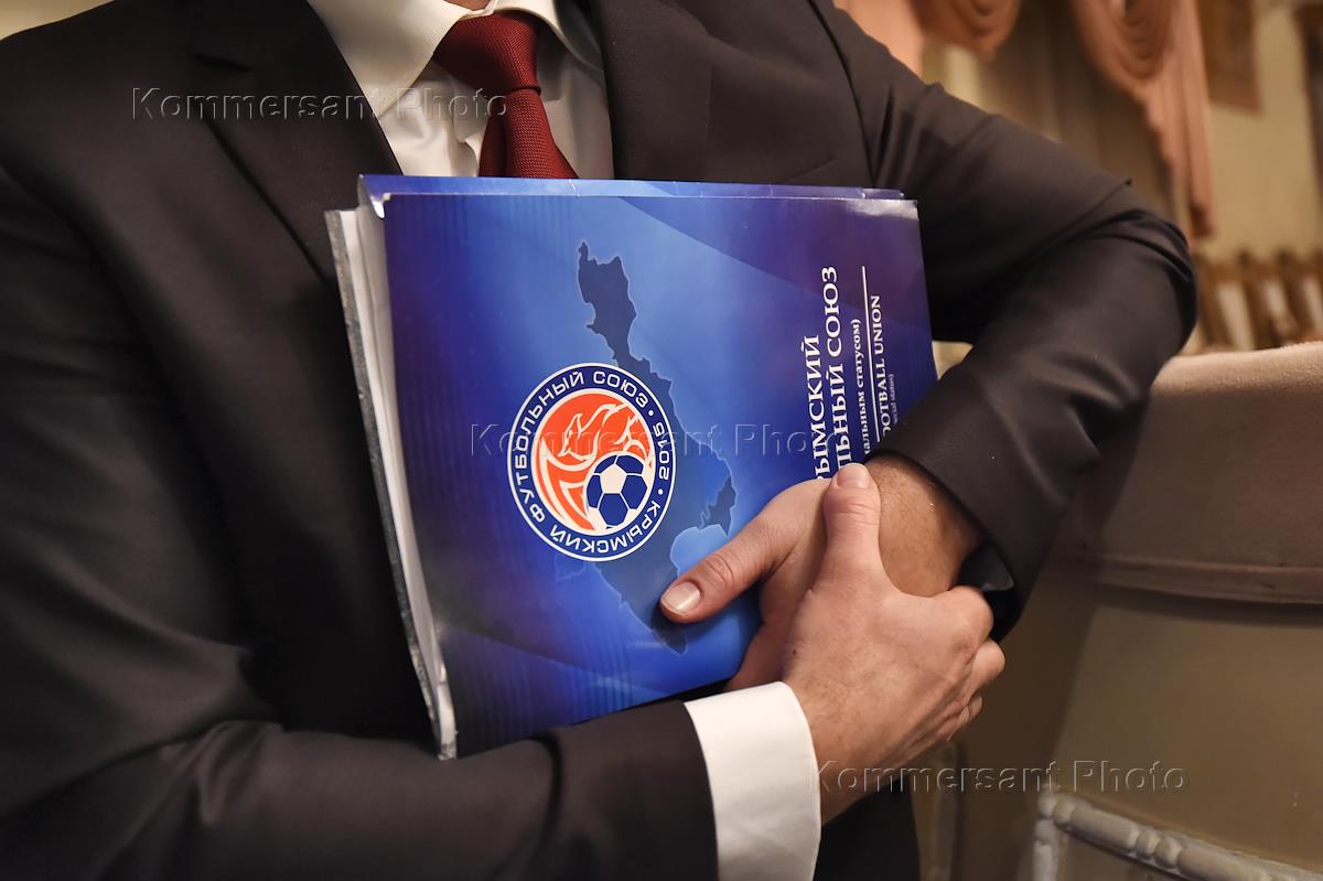 Крымский футбольный форум. Жанровая фотография. Документы в папке с эмблемой "Крымского футбольного союза".