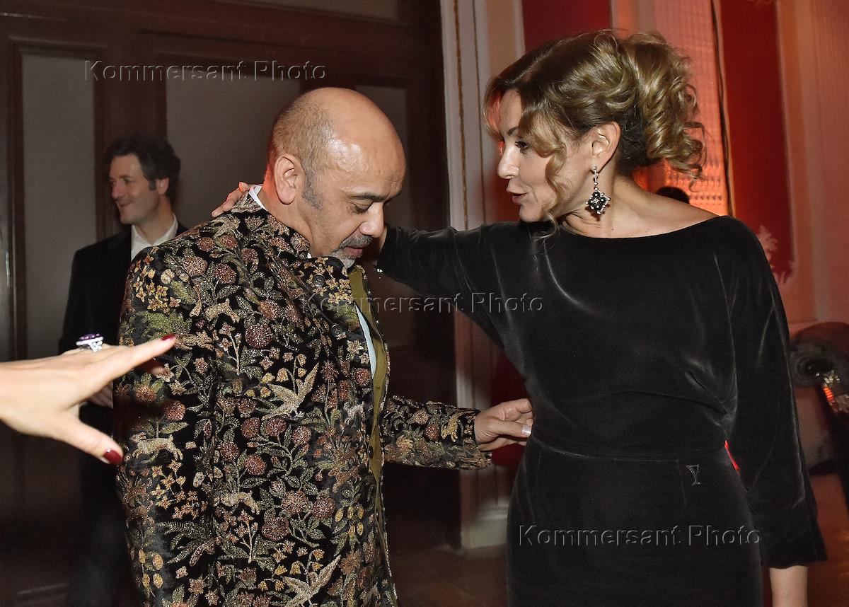 Коктейль по случаю открытия флагманского бутика Christian Louboutin в России в бутике Christian Louboutin. Французский дизайнер Кристиан Лубутен (Christian Louboutin) (слева) и телеведущая Сати Спивакова (справа) во время мероприятия.