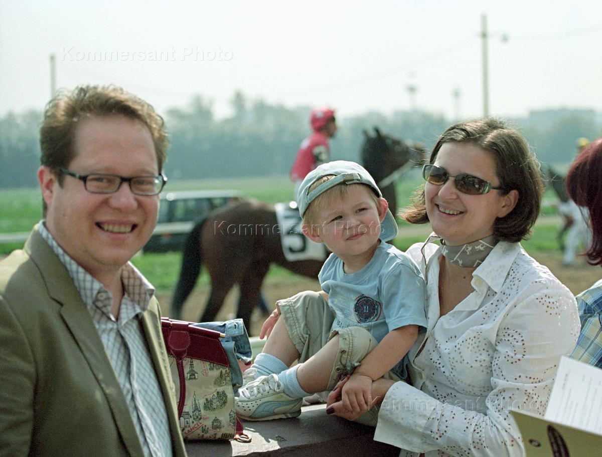 Couple Vadim Kurilov ("Kofidek" company) and editor-in-chief of the "Seasons" magazine Olga Sergeeva attend the award ceremony of the winner of the "Nasibov cup" race. The race was held at the central Moscow hippodrome.