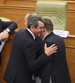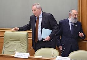 Заместитель председателя правительства России Дмитрий Рогозин (слева) и член комитета Государственной думы России по международным делам Артур Чилингаров (справа) во время заседания государственной комиссии по вопросам развития Арктики, посвященное выполнению госполитики в регионе за год и плану работы в 2017 году. Заседание прошло в Доме правительства России.