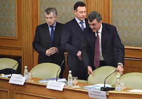 Заседания государственной комиссии по вопросам развития Арктики, посвященное выполнению госполитики в регионе за год и плану работы в 2017 году. Слева направо: губернатор Ярославской области Сергей Вахруков, полномочный представитель президента России в Уральском федеральном округе Игорь Холманских и полномочный представитель президента России в Сибирском федеральном округе Сергей Меняйло во время заседания в Доме правительства России.