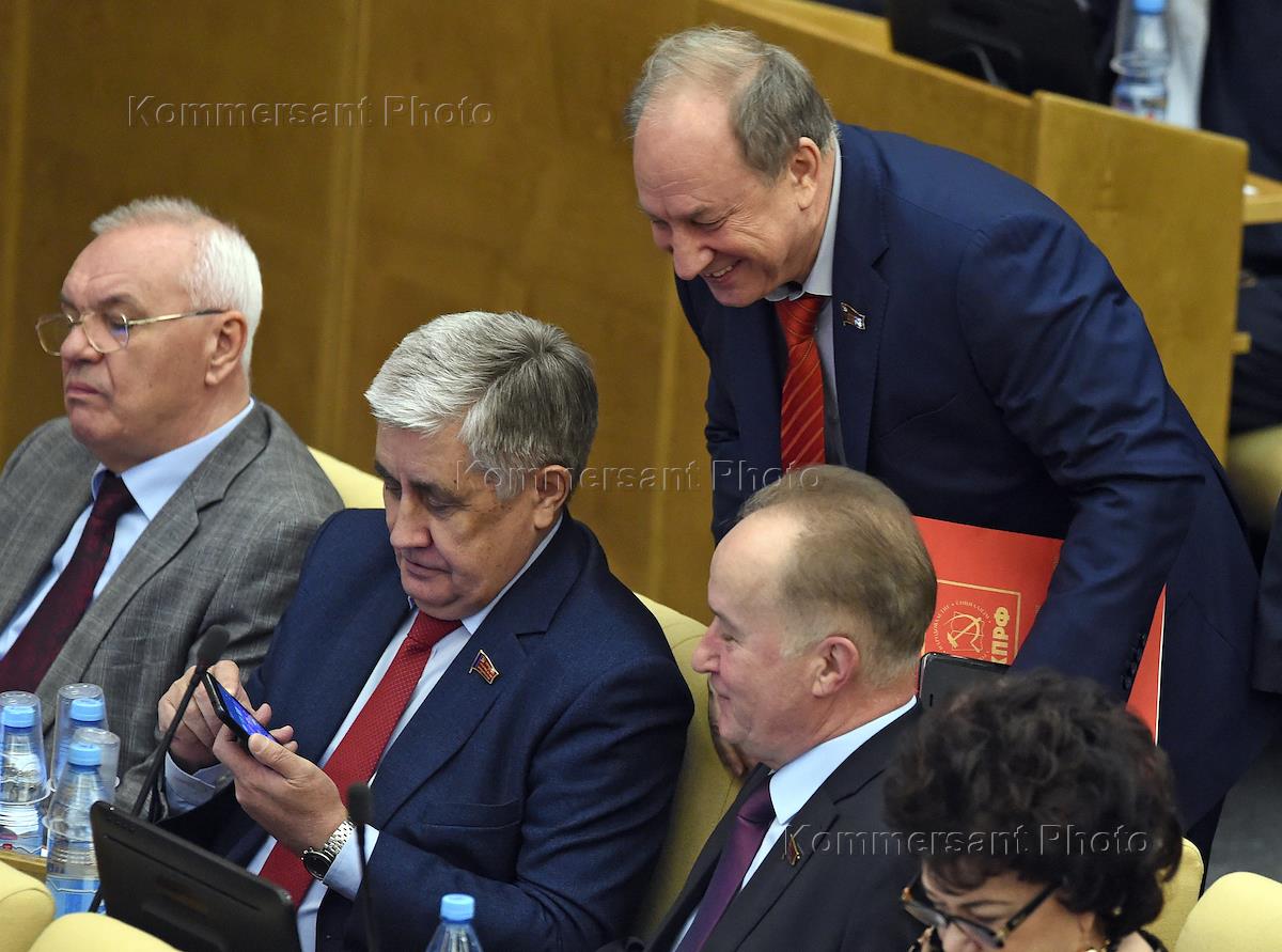 Пленарное заседание Государственной думы (ГД) России. Слева направо: член комитета ГД России по региональной политике и проблемам Севера и Дальнего Востока Сергей Решульский, первый заместитель председателя комитета ГД России о бюджету и налогам Валентин Шурчанов и первый заместитель председателя комитета ГД России по делам национальностей Валерий Рашкин во время заседания.