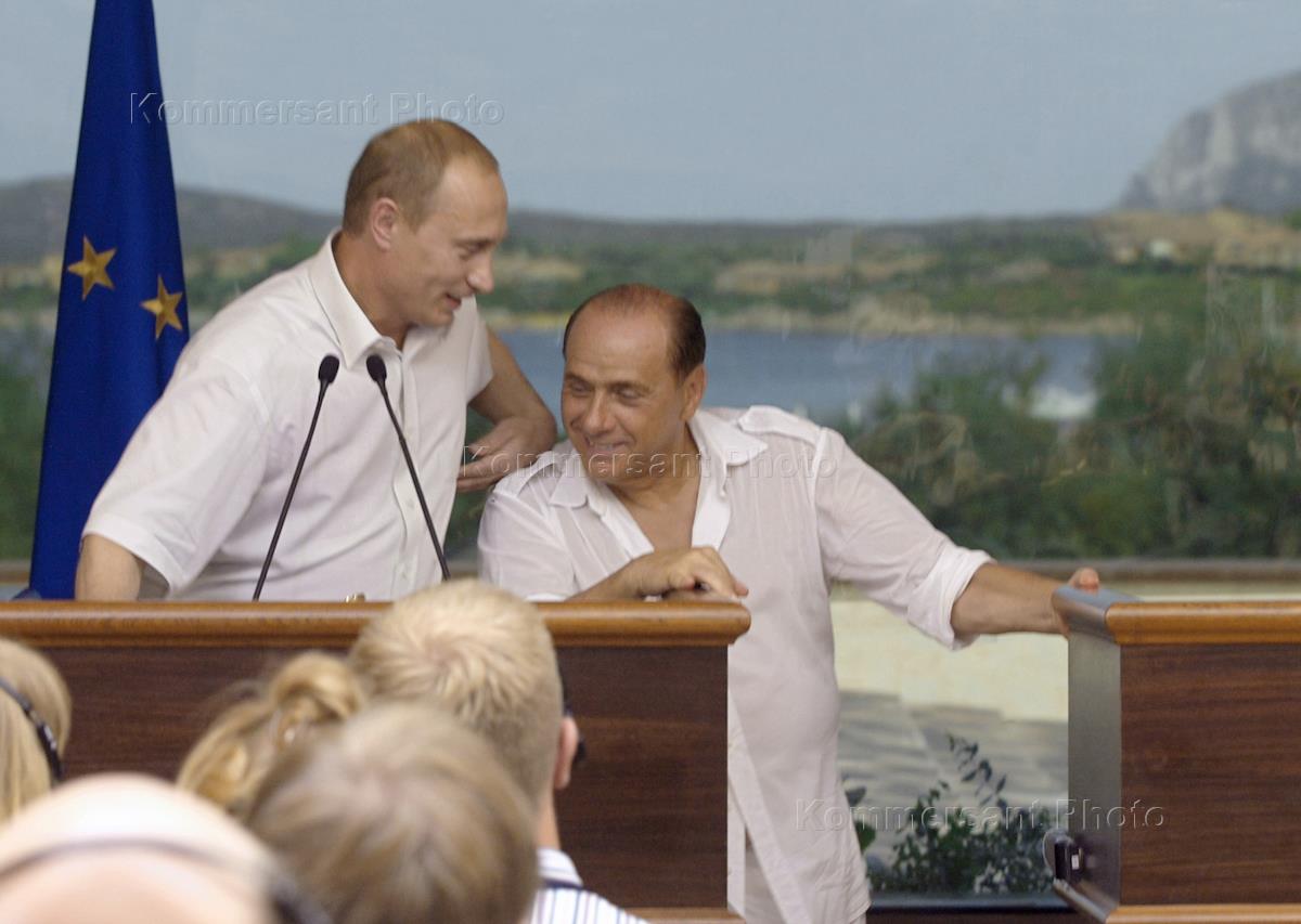 Russian president Vladimir Putin and Italian Prime Minister Silvio Berlusconi take part in the news conference summoned to discuss the results of the two leaders' meeting in Mr Berlusconi's Villa Certosa on the isle of Sardinia.