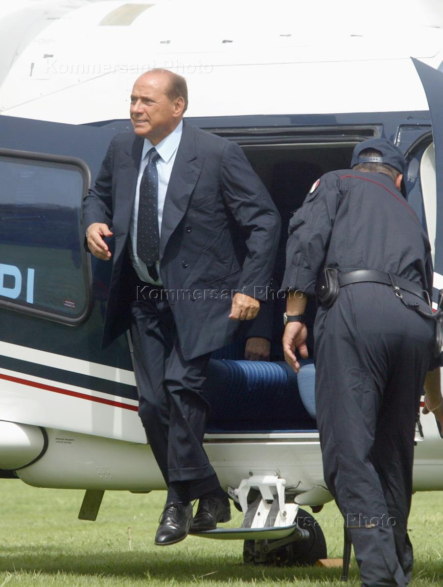 Russian president Vladimir Putin (right) arrives at the italian island Sardinia where he will meet with the italian prime-minister Silvio Berlusconi (left). They leave for the Porto-Rotando resort by the helicopter.