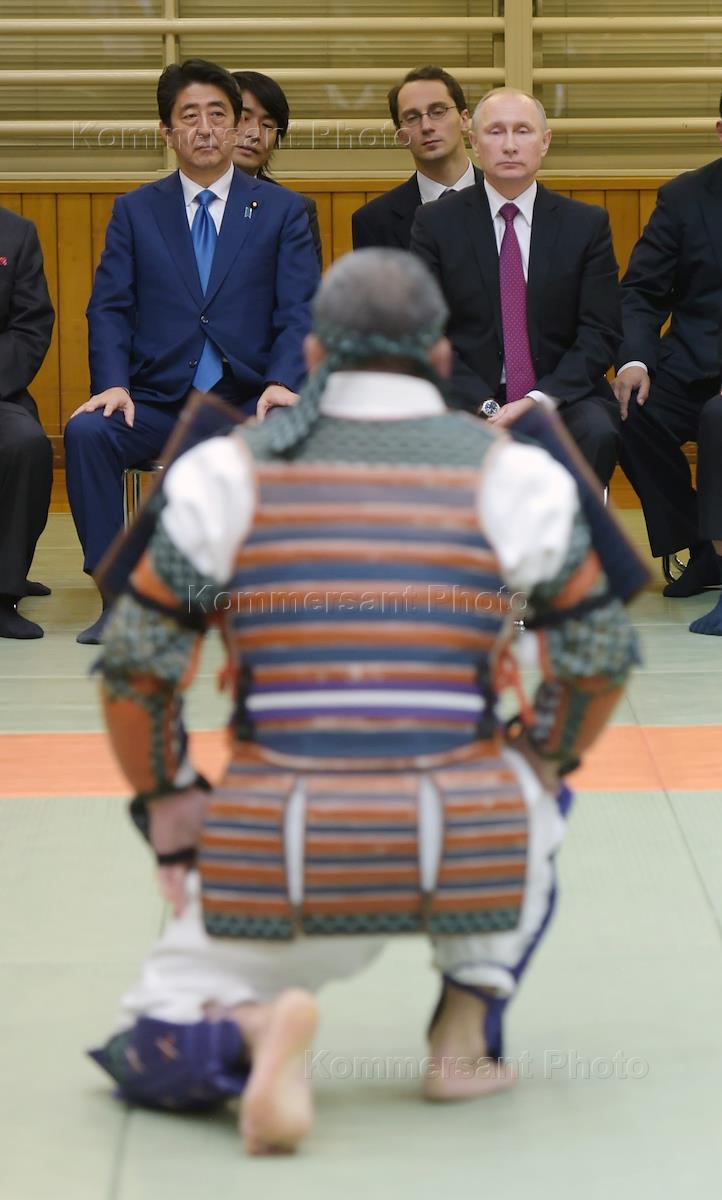 Japan's Prime Minister Shinzo Abe (wearing blue) waits for the arrival of Russian President Vladimir Putin.