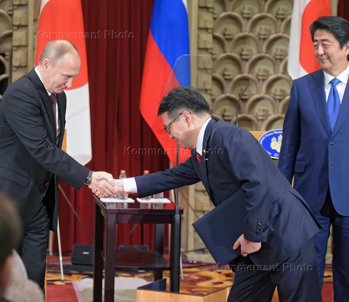 Рабочая поездка президента России Владимира Путина в Японию. Слева направо: президент России Владимир Путин, министр экономики, промышленности и торговли Японии Хиросигэ Сэко и премьер-министр Японии Синдзо Абэ во время церемонии подписания российско-японских документов по итогам российско-японских переговоров.