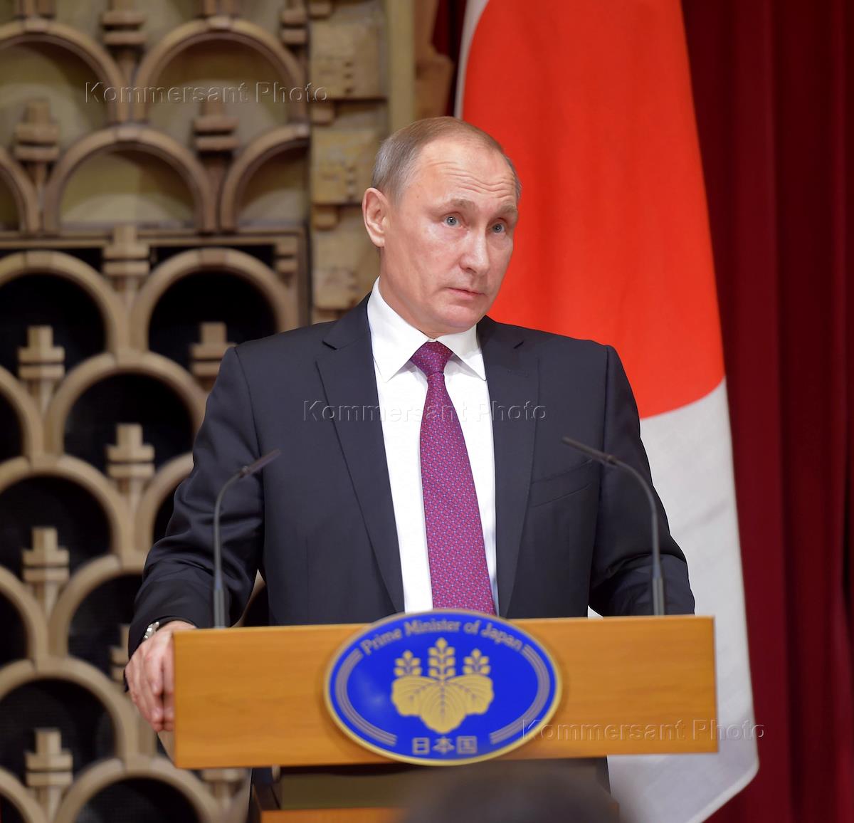 Рабочая поездка президента России Владимира Путина в Японию. Президент России Владимир Путин во время совместной пресс-конференции c премьер-министром Японии Синдзо Абэ по итогам официальной встречи.