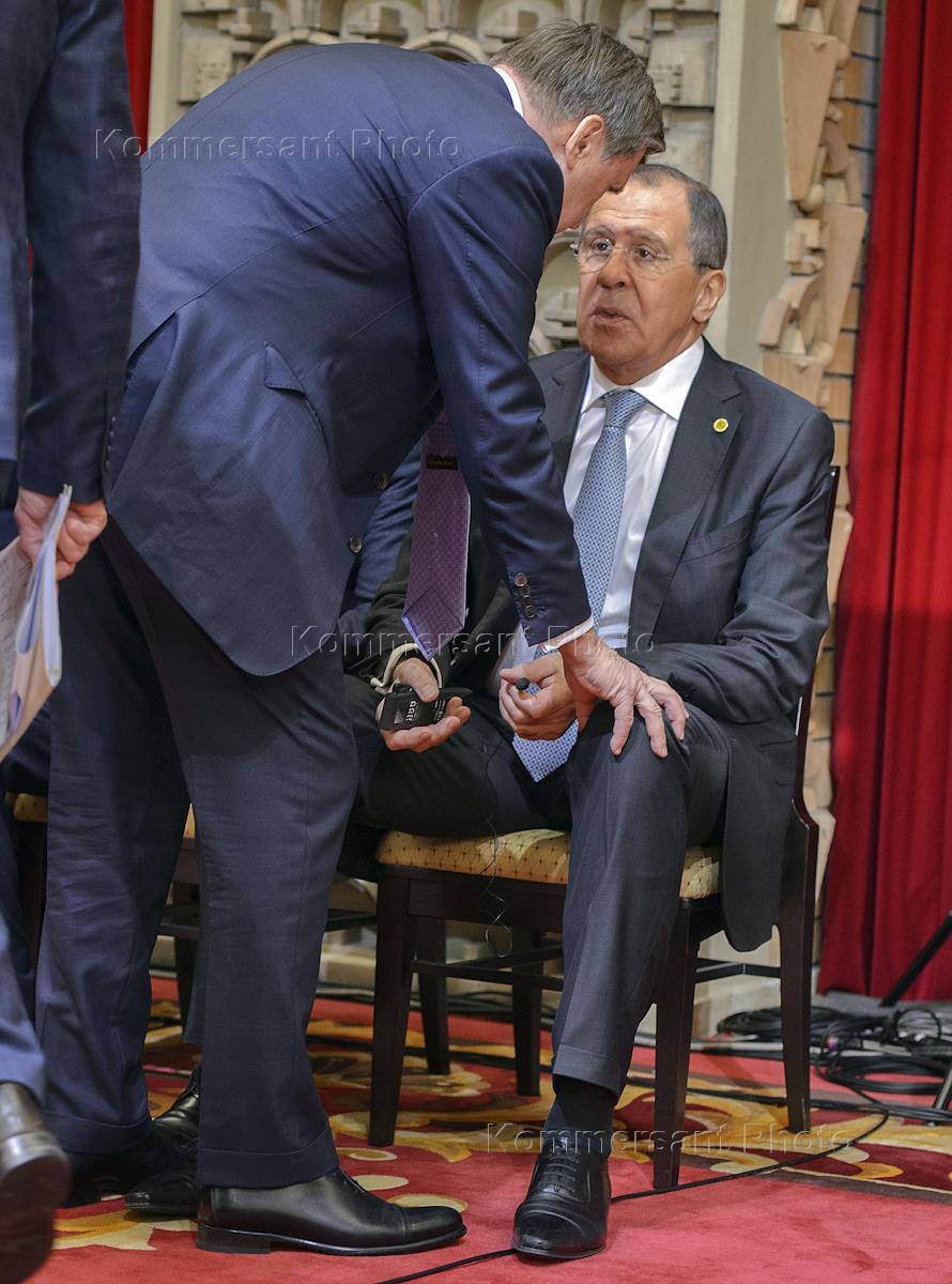 Russia's Foreign Minister Sergei Lavrov (centre) arrives for Russian President Vladimir Putin' meeting with Japan's Prime Minister Shinzo Abe.