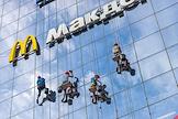 Жанровая фотография. Промышленные альпинисты моют стеклянную стену торгового центра. Вывеска ресторана "Макдоналдс" (McDonald`s).